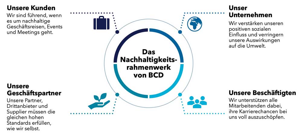 BCD Travel ist seit langem als führende TMC im Bereich Nachhaltigkeit anerkannt. Unser Platin-Rating von EcoVadis, unsere ISO-zertifizierten Büros und Systeme sowie unser langjähriges Engagement für den UN Global Compact und die Nachhaltigkeitsziele der Vereinten Nationen zeichnen uns aus. Jetzt ist es an der Zeit, unser Engagement für Nachhaltigkeit auf die nächste Stufe zu heben. Wir müssen die Kraft unserer Netzwerke nutzen, um Einfluss auf eine nachhaltigere Geschäftsreisebranche zu nehmen - eine Branche, die einen sinnvollen Mehrwert für Reisende schafft, den Menschen und Orten, die Reisende beherbergen, greifbare Vorteile bringt und die Auswirkungen auf die Umwelt minimiert.