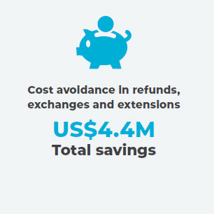 Of the total US$ 4.9 million on file, BCD achieved a total cost avoidance of US$ 4.4 million in refunds, exchanges and extensions, representing a 90% savings to date.